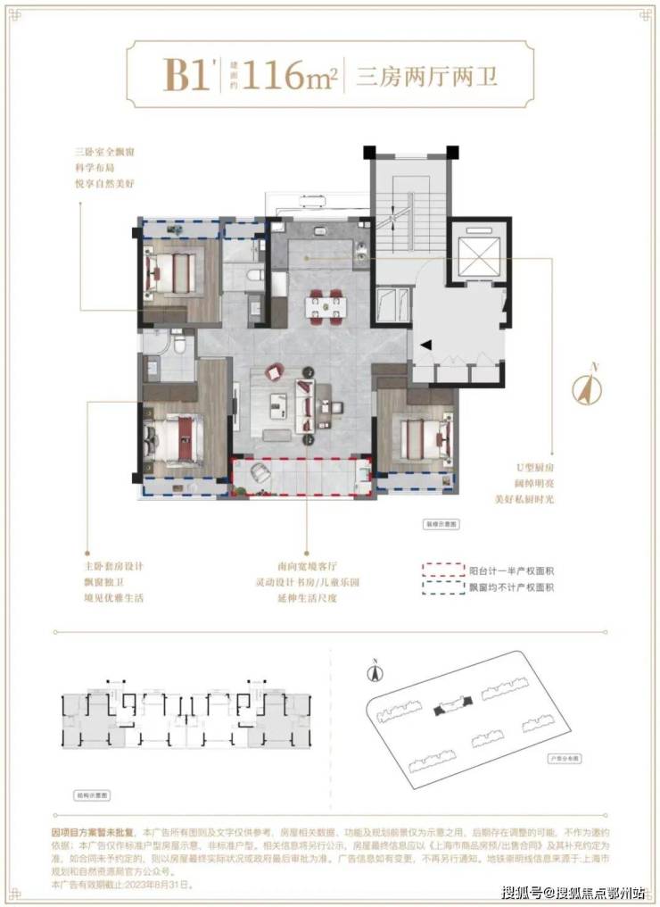 116m²户型特点:三卧室全飘窗,科学布局,悦享自然美好, 南向宽境客厅,灵动设计书房/儿童乐园,延伸生活尺度, U型厨房,阔绰明亮,美好私厨时光, 主卧套房设计,飘窗独卫,境见优雅生活。