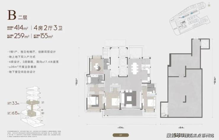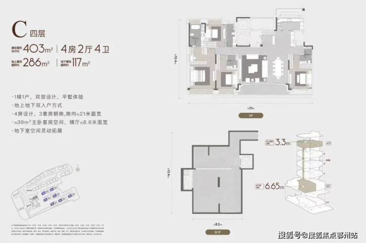 建筑面积合计约335-445m²,地上建筑面积约226-286m²,地下建筑面积约108-186m²,地上层高3.3m,地下层高4-6.65m,双入户方式,坐享买一层得两层的平墅生活。