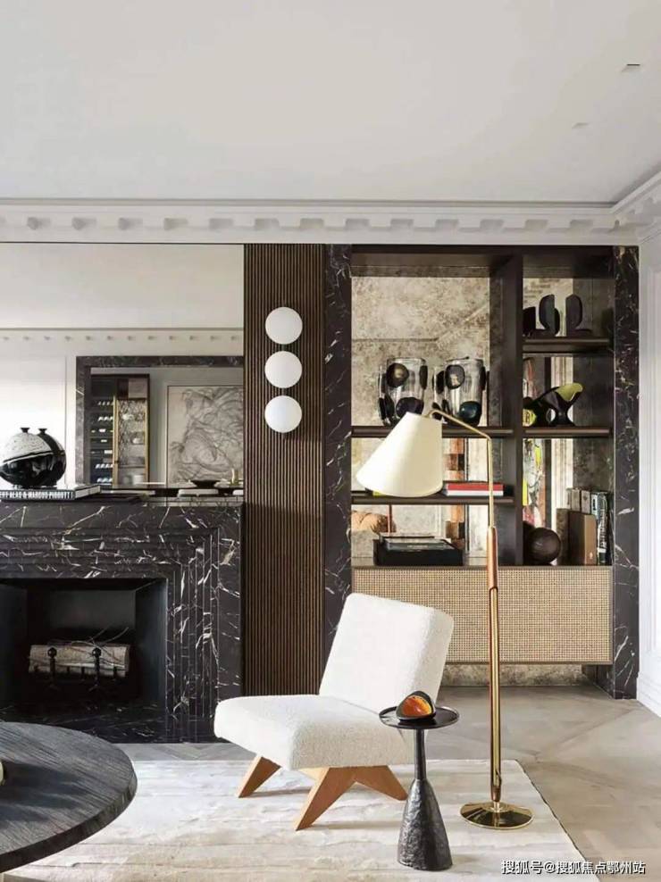 餐客厅尺度达到了惊人的 16米,97m²,用一席壁炉做了视线分离,米色的洞石、自然冰裂纹的艺术漆。背景墙拱形胡桃木的静谧,地板拼花木格纹的精细,沙发钢琴键织布的韵律,营造的是回归生活本质的轻松写意。