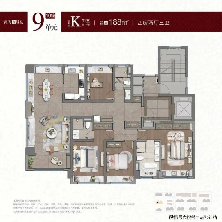 约188㎡四房:作为项目的 “旗舰户型”,188㎡四房三卫采用十字中轴动线,三卧朝南 + 双套房设计,满足多代家庭对隐私与阳光的双重需求。