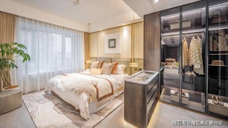 面宽约3.5米,进深约5.2米的主卧,呈套房设计。干湿分离的厕所、L型衣帽间、精致的梳妆台……满满都是人性化的设计。