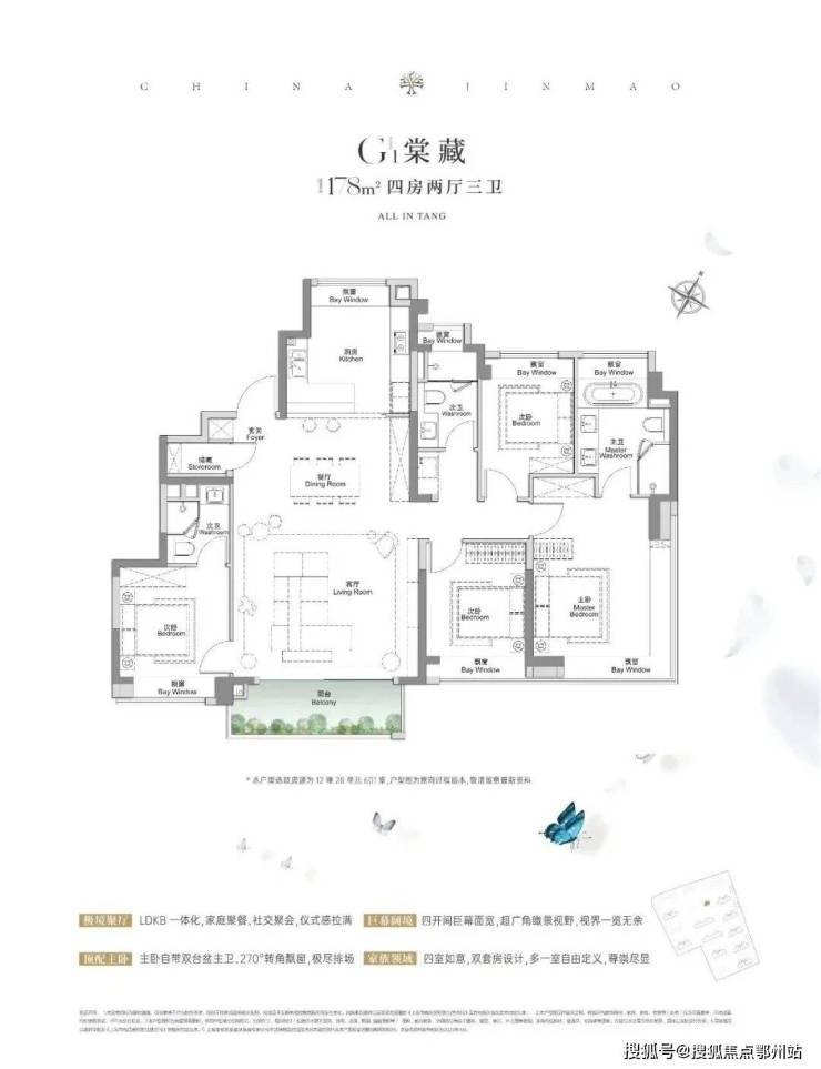 建面约117㎡3房2厅2卫 ,做到了 3+1开间朝南+5个飘窗+主卧套房设计+270°转角飘窗, 所有的尺度都有进一步提升。