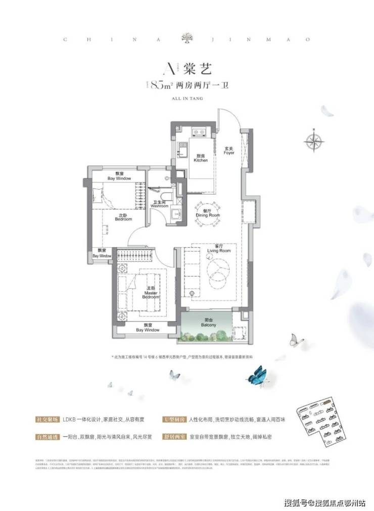 建面约97㎡3房2厅1卫 ,户型 三开间朝南、再加上“3个飘窗+双面阳台系统” ,不管是采光、视野、通风、私密性,还是实用性都十分出色。