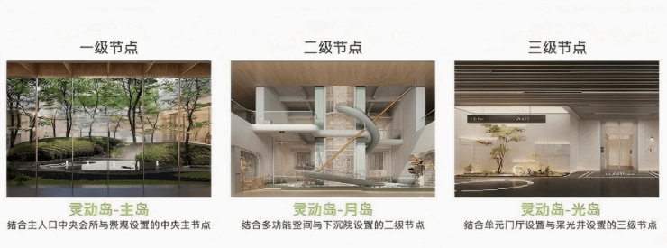 在设计策略上,项目以“生机之环.林下学堂”为理念,以“岛”为主题,利用架空车库的天然优势,打造全领域、多元、多层次体验的主题“岛”空间,分别为主岛、月岛、光岛,手法上将自然光引入社区每个空间,形成全自然光无风雨双大堂归家体验;并在将不同空间相互串联,形成一个层次丰富、流动自由的绿色生活场域。