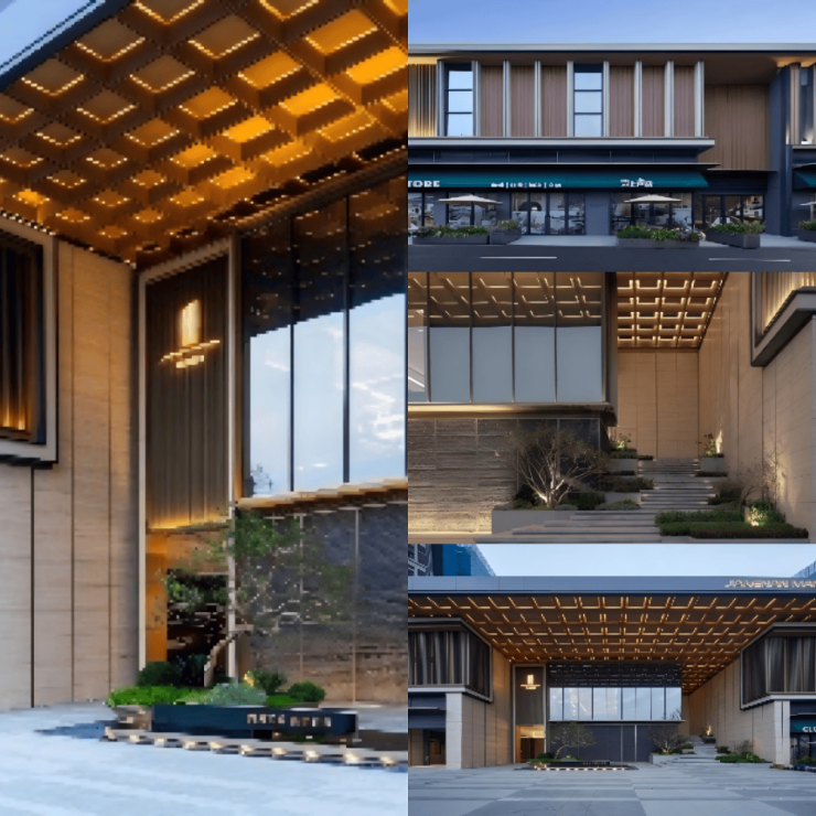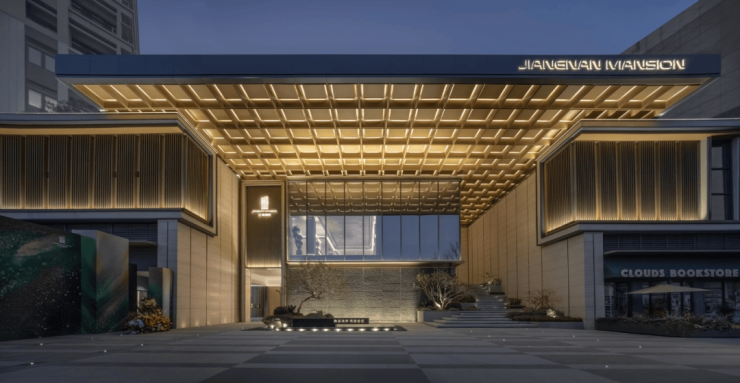 在社区主入口形象上,核心策略是顶部设计一个伸飘大雨蓬造型,烘托整个入口气势和形象,且雨篷下底面采用细致的考虑小藻井的造型,在灯光的加持下,特别有韵律美和标识感,用木纹转印铝板材料也是希望呈现归家时候温暖的一面。正面预留的界面上下两层采用不同的处理方式,首层运用统一干净的黑色毛石面材料,可以和景观更和谐的统一,也可以反衬二层玻璃面的视觉焦点感,达到了功能与造型的完美契合。