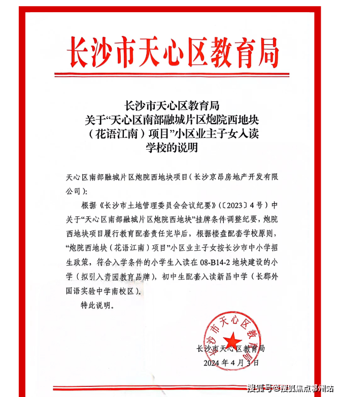 2024年4月3日,天心区教育局发布文件,明确说明花语江南业主子女可配套入读青园实验小学和长郡外国语实验中学