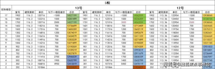 从5楼开始,单价呈现小幅阶梯式上涨,直至实际楼层14-15楼出现一次较大幅度跳价,这主要考虑到高楼层拥有更开阔的视野与居住舒适度。