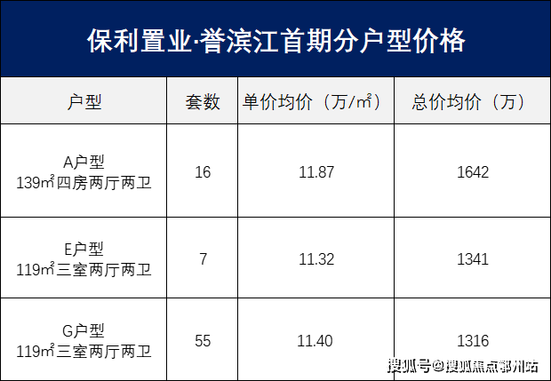 中间套G户型119㎡三室两厅两卫,单价均价约11.40万/㎡,总价均价约1316万。