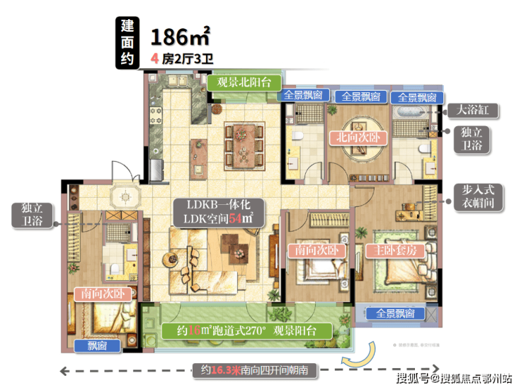 南向逆天面宽 约16.3米,双联阳台足足约 16平方,理想型的开间与进深,呈现大家族才有的气场。