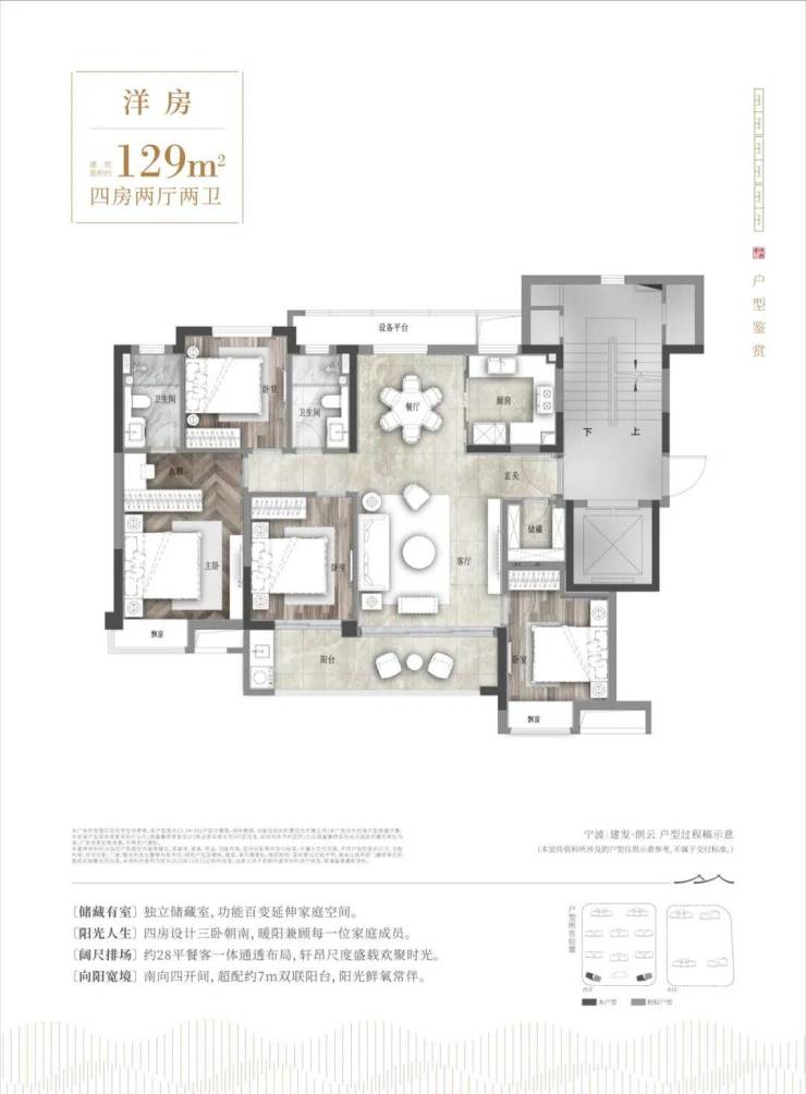 洋房129户型:四开间朝南、独立储藏、可放圆桌、正四房