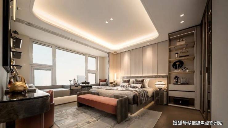 主卧套房开间最大约7.2m,气度可媲美平层阳台尺度。背景墙以编织纹皮革硬包结合隐光灯带,铺陈温润氛围;整体空间选用大面墙布、鱼骨拼实木复合地板、不锈钢踢脚线与大理石飘窗台等,精工细节致敬层峰人士的舒适体验。