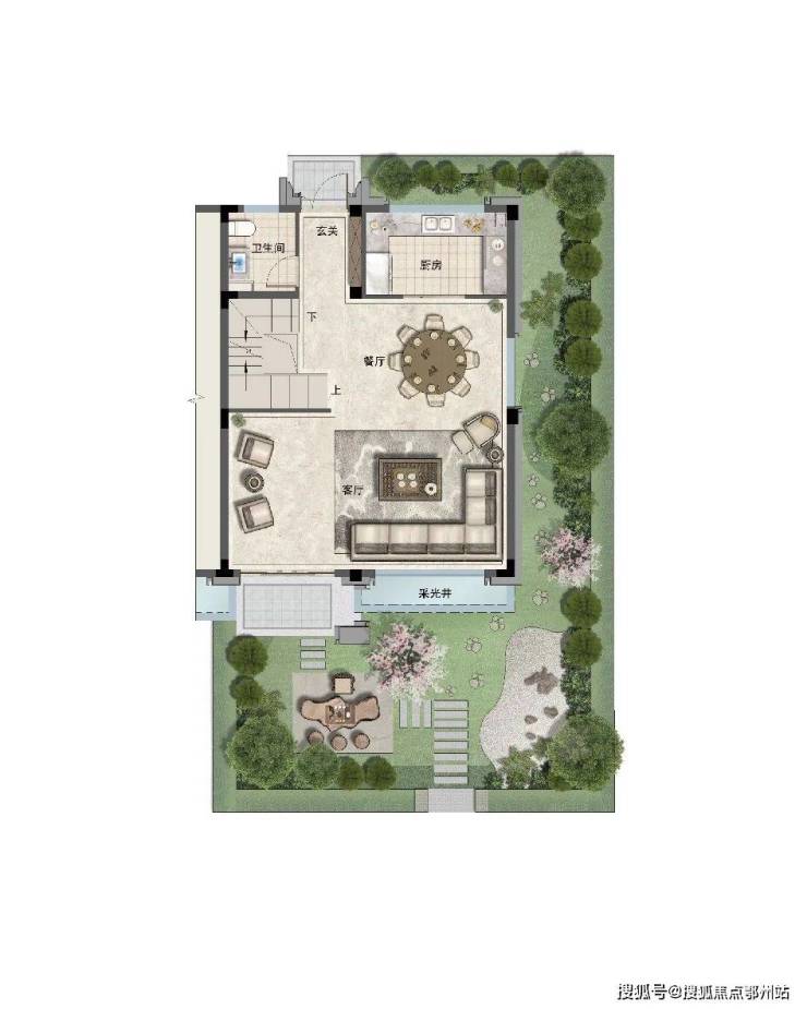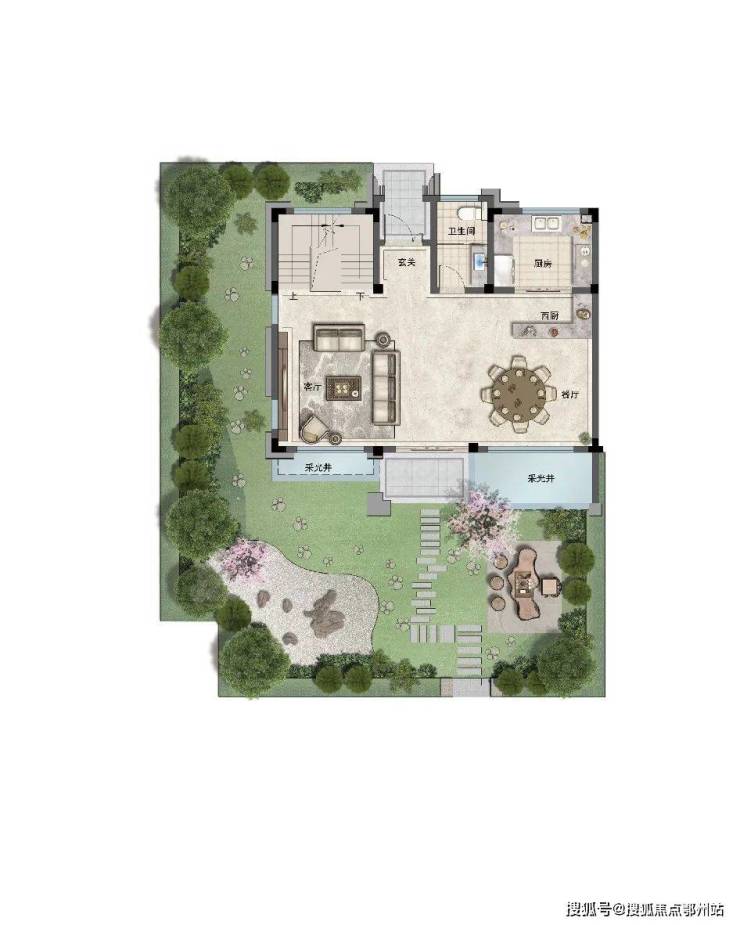 一层作为社交主场, 一体化餐客厅直通庭院 ,孩子的生日派对、家人的星空烧烤,随时开启充满仪式感的生活。