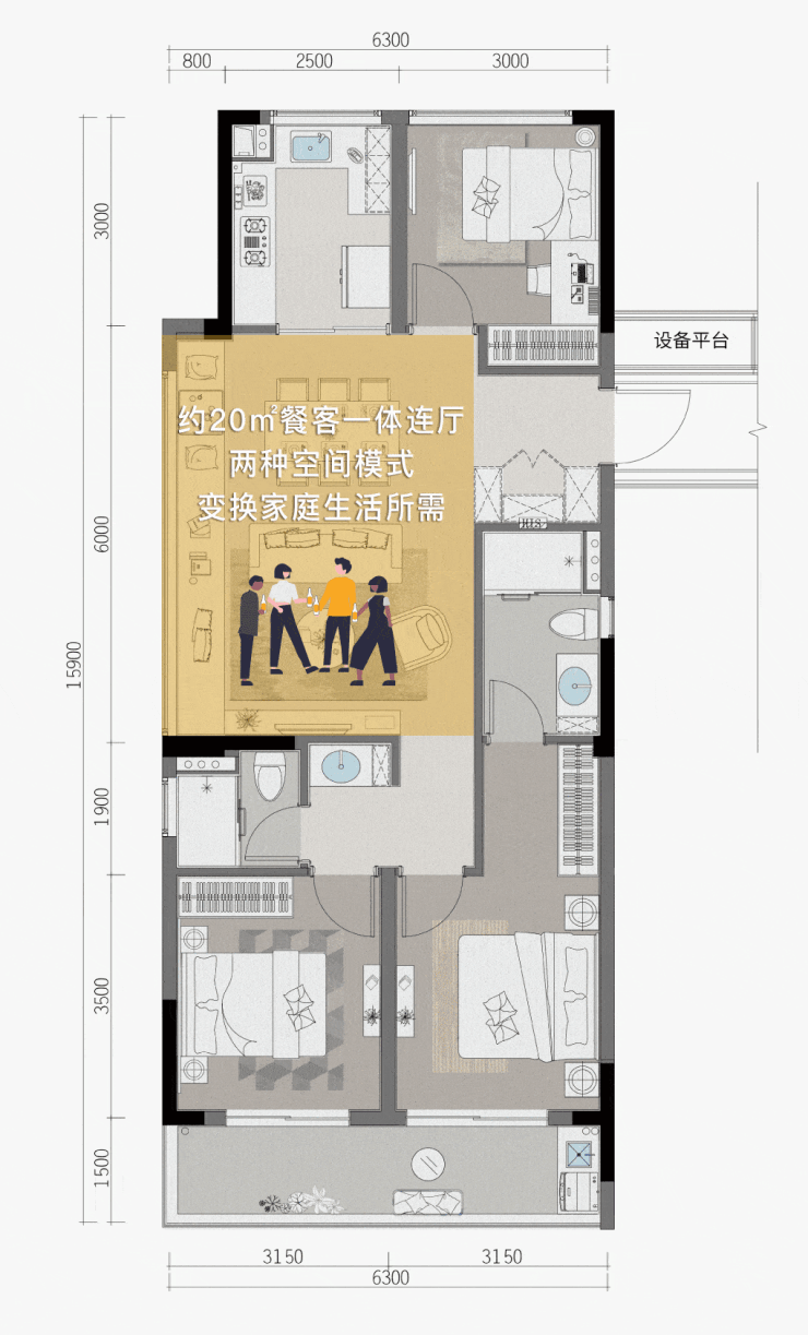 阳台作为人居空间的延伸,装载着四季清风与阳光,寄托着城市人居的美好梦想。约6.3米宽的大尺度双连阳台,与双卧室相连,