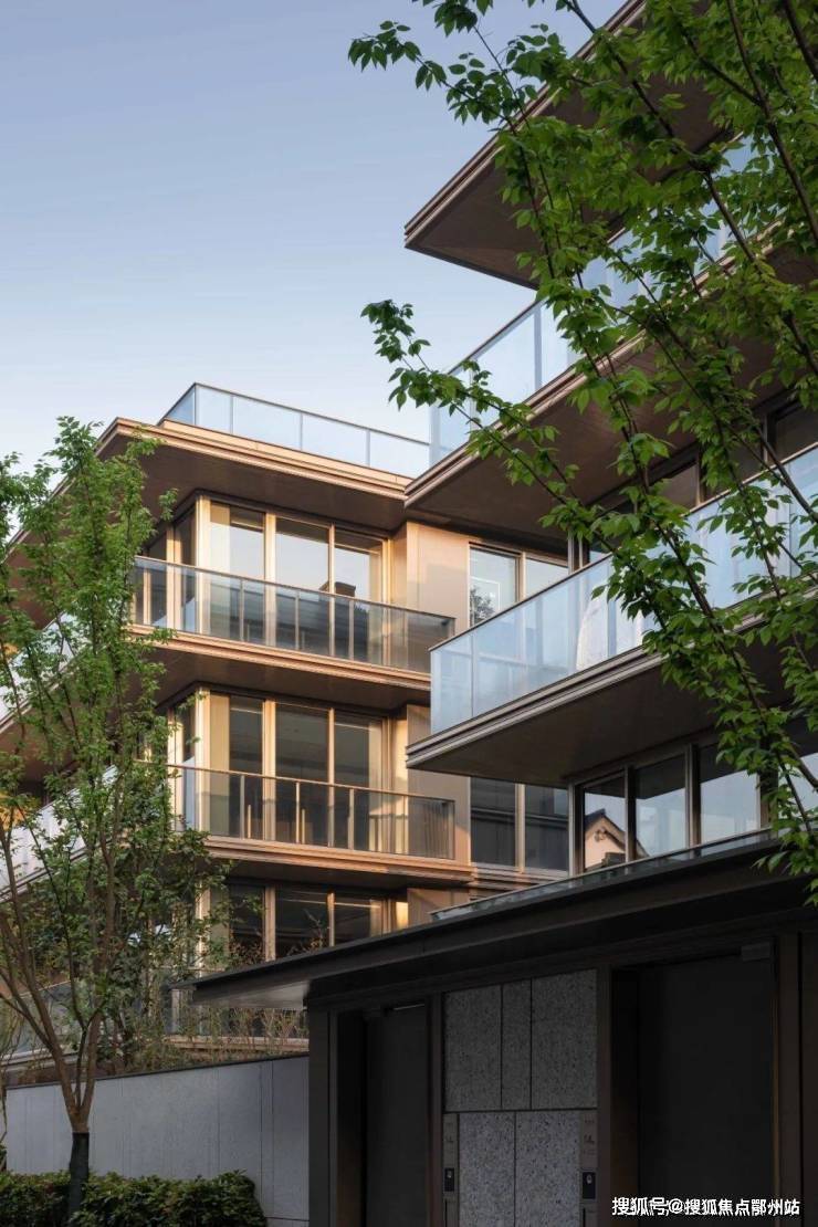 建筑立面,逸庐采用现代东方美学的建筑理念 ,大面积石材+铝板+玻璃+金属格栅+金属构建等材质,整体建筑设计是大面宽、高窗地比。
