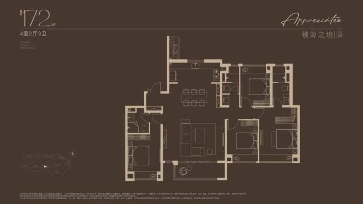 建面约172㎡4房户型,多娃家庭的进阶之选!奢阔尺度尽显家族气度!2梯2户, 子母双开门礼序入户,私密尊崇门厅;约 16米四开间朝南 ,搭配约 6米尺度横厅 ,揽四时风景入怀。