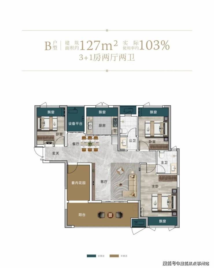 只计算一半面积的阳台、套内花园!不计面积的设备平台、飘窗,室内实得面积飙升,达到了约103%!功能自由变化,进阶家庭多元需求。
