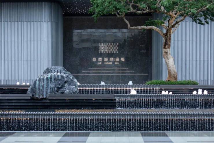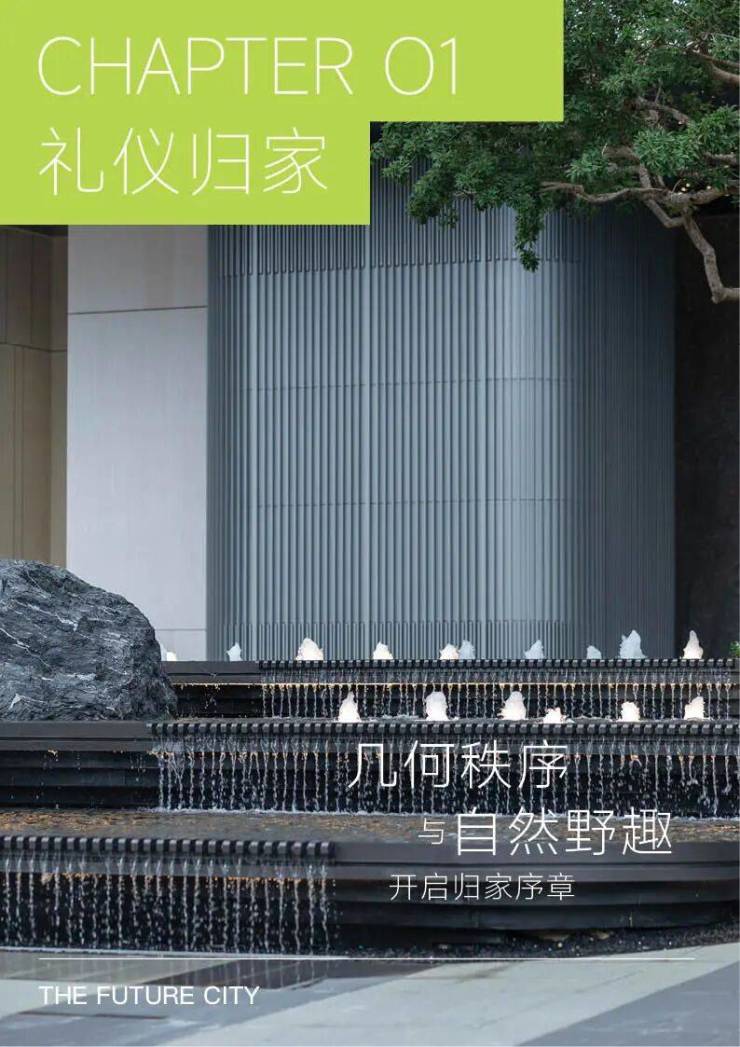 主入口以倒圆角矩形水景构筑三层跌水,黑金沙花岗岩与水面形成虚实界面。造型铁冬青破水而出,涟漪与树影随跌水声渐次舒展。几何秩序与自然野趣的石块形成碰撞,以流动光影织就归家序章。
