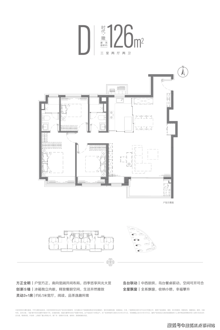 建面约126m²三房两厅两卫户型,南向3+1面宽横厅设计,让空间更加随心而变。主卧双台盆配置,用空间拥抱自然中的无限自在。