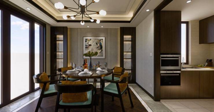 从产品形态上看, 建邦国宸府 打造的是金山新城极为稀缺的 墅居产品 ,由 高层+叠墅 组成,建筑风格为 现代中式滨海风格 。其透露出的中式意境和构图美学我们可以从景观绿化一窥端倪: