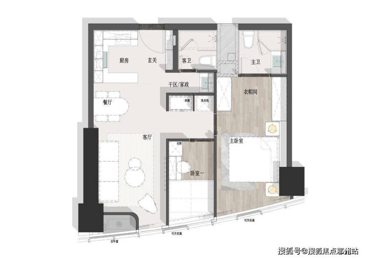 主卧东面采光,宽奢套房设计,独立卫生间双面盆设计,超大衣帽间配置;