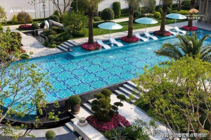 利用新规后的高低差设计,潮语臻境府做出了一个“空中花园“,最中间部分即为”悬浮度假泳池“,摇曳的海枣树阵,度假风十足的廊架、躺椅,随手一拍,都有着马尔代夫的风情。
