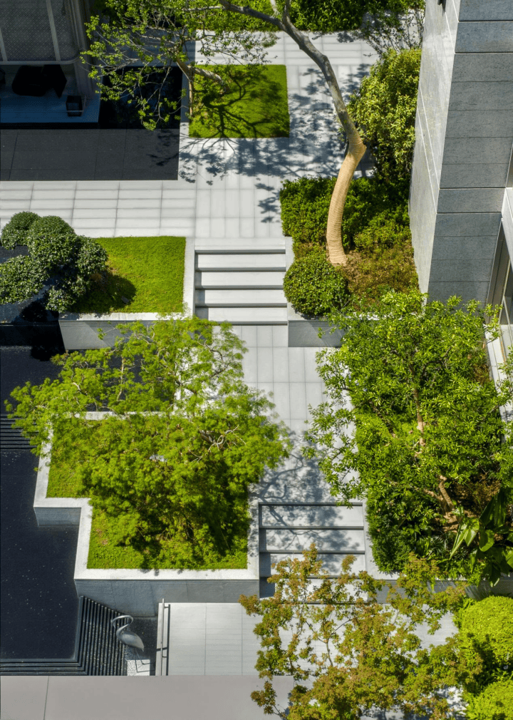 有背山必须傍水,从小区正门的 独立高端会所 进入园区后, 之江壹品 特意作了 退进式梯度入口 ,中心引入 意式跌水水景 ;从两侧围着水景、顺着山势的缓坡台阶漫步往上,在跌水的终端是 卡洛斯卡帕 式的雕塑 出水口和一棵中型落叶乔木作纪念性空间;