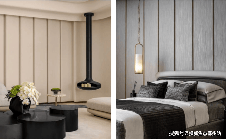 南向主卧套房约30㎡,设有步入式衣帽间及独立卫浴。 主卧特色背景墙由两种墙布搭配布置,上方背景墙通过波浪造型使得空间更加丰富。