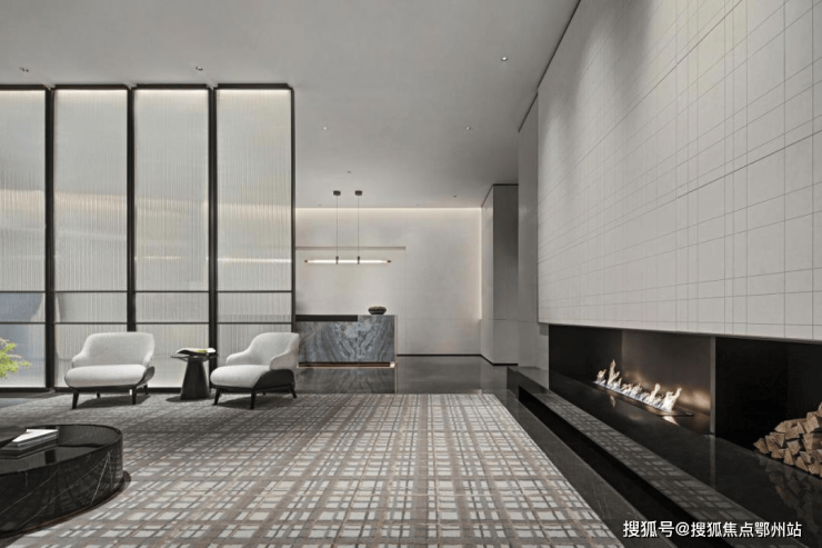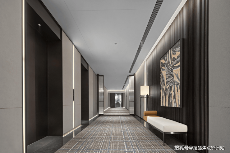 达美公馆,在首层及地下车库均打造了入户大堂,采取会所转化入户形式,路过会所,再归家。因与酒店同栋,建筑核心筒电梯间动线稍长,于是通过围合感屏风分段,让空间一分为二,并设等候区及艺术廊,添了一丝趣味。