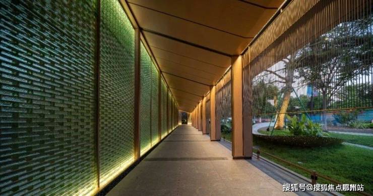 这条L形的 游廊净高约5.4米。内侧由上万块精磨青绿琉璃砖砌成,外侧是垂落有序的金属帘缦。将来全部交付,游廊总长将达110米,总成本(400万)相当于4个泳池。