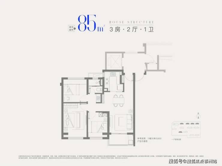 建面约85㎡3房1卫,做到 三开间朝南+全卧室带飘窗+卫生间干湿分离+动静分离,非常紧凑的小3房。
