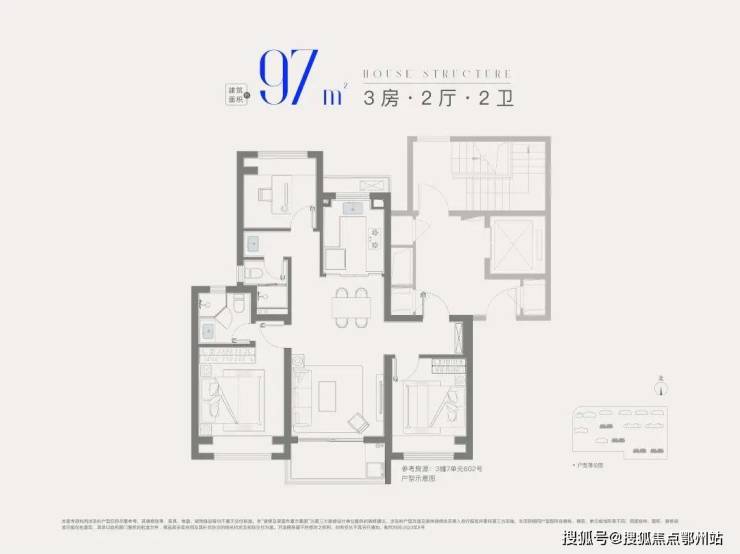 建面约97㎡3房2卫,升级版大3房, 入户玄关+主卧套房设计,整体私密性更强,空间更为宽敞。