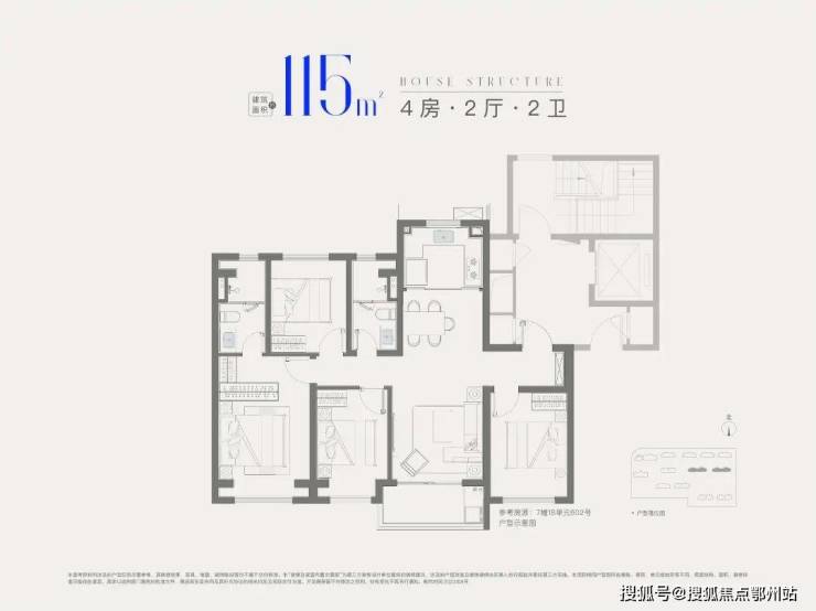建面约115㎡4房2厅2卫,做到了 四开间朝南+全卧室带飘窗+主卧套房设计,一步到位的大四房户型。
