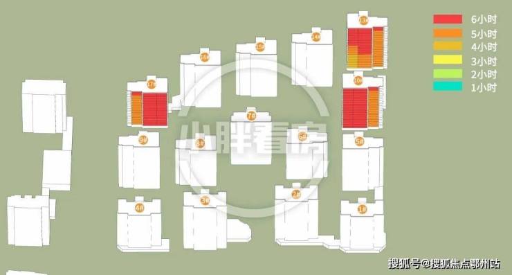 17号楼采光优异几乎不存在遮挡,10号楼低层受遮挡,13号楼中低层受遮挡。就具体遮挡时间而言,10号楼主要在傍晚受7号楼遮挡,13号楼主要在下午受14号楼遮挡。