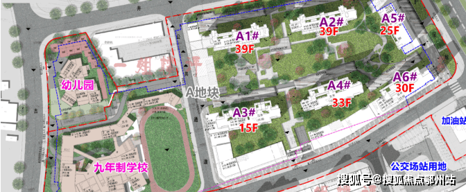 A地块占地面积约5.8万方,总建面约20.6万方,住宅建面约12.2万方,幼儿园3600方,九年一贯制中小学1.4万方。容积率2.59,共1117户,机动车停车位1530个,住宅车位比约1:1。