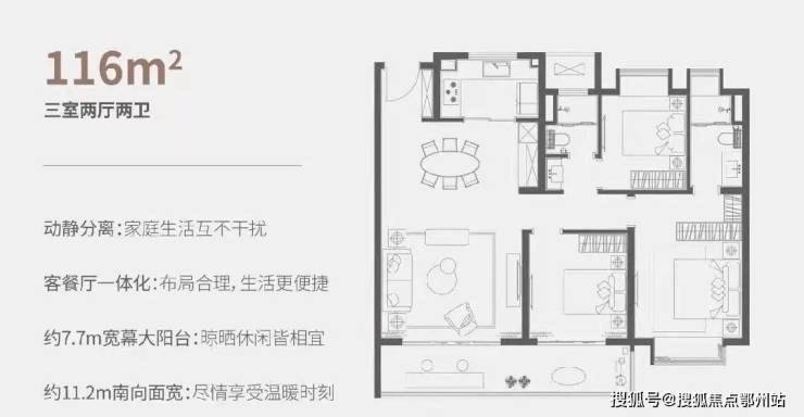 世茂璀璨未来本次首开建面约 98㎡、116㎡ 两大户型产品,多开间朝南、宽景阳台,三房两卫起步,满足刚需/刚改客群对居住尺度的要求。