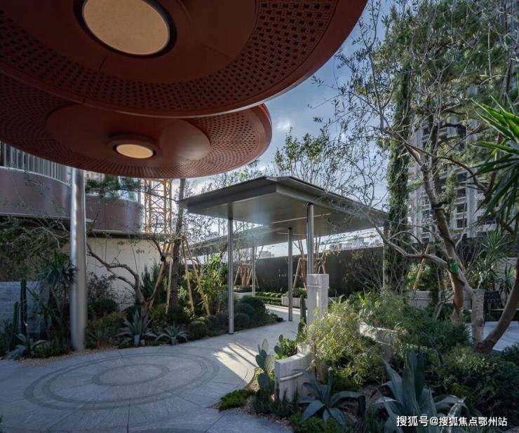 绿宝石花园以莫奈《睡莲》为灵感,打造约30米长的水景花园;林间溪谷则采用椭圆水池设计,汲取克罗耶《斯卡恩的夏日傍晚-海滩散步》的艺术意境,营造水景与休憩空间的交互体验;城市露台位于6号楼下,面向中兴公园,异域植物环绕的阶梯提供从高向低的景观视野,塑造城市与自然的层次感。