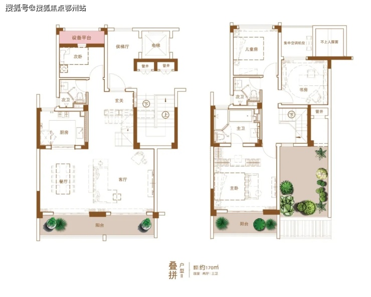 再来看一下叠拼户型,据悉下叠送面积约60平方大花园,上叠赠送面积约20平方超大南向屋面。