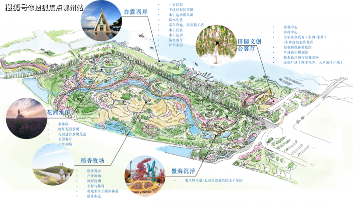 所谓“一镇一浜,二田三市”即是以沙家浜镇水浜资源为基础,打造田园大型体、欢乐田园特色自然观景以及时光小镇内部街市、水市、镇市三市丰富旅游景观。