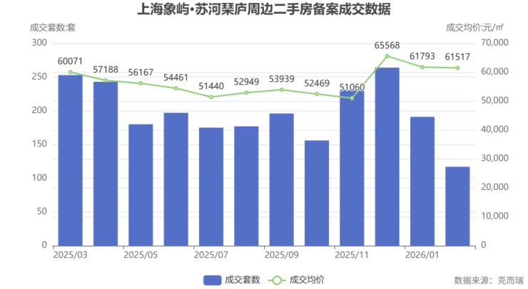 周边二手房成交数据显示,2025 年 12 月成交均价达到 65568 元/㎡的峰值,2026 年 2 月仍维持在 61517 元/㎡的高位。这说明区域价值持续得到市场认可。