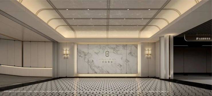 精装地上大堂,地面的石材拼花造型,墙面的石材背景,将静奢海派的艺术展现的淋漓尽致。