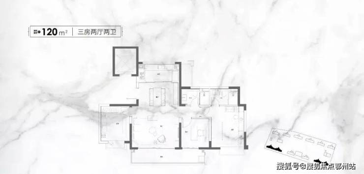 建面约120㎡三房两厅两卫户型,同样是三房,相较于建面约110㎡更大的面积,意味着居住舒适度会更高。