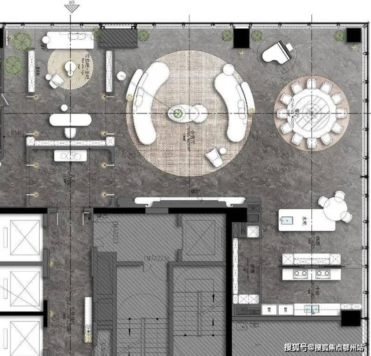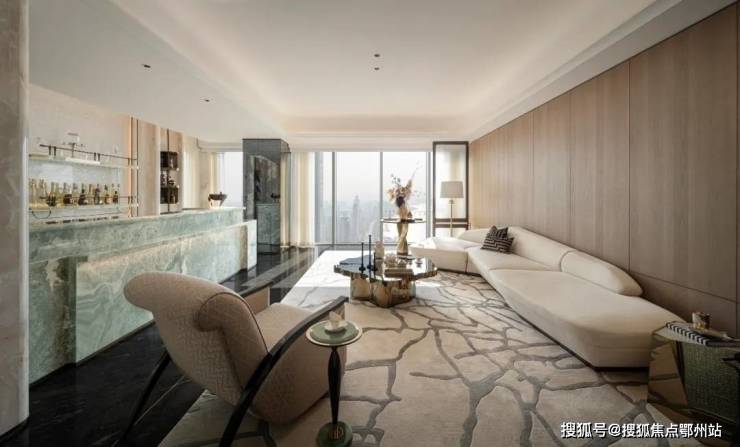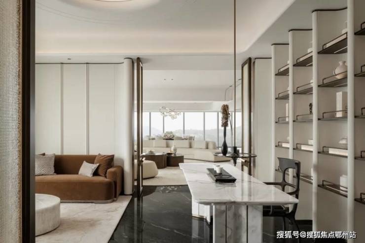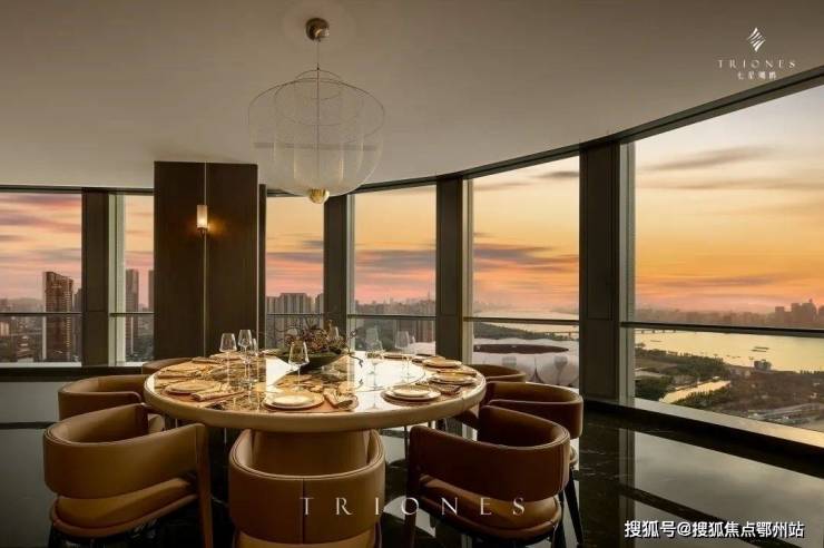 餐客厅尺度150m²,因为柱网和梁,同时毛坯交付,把更大面积给客厅,小跨给餐厅,目前作为营销展示私宴用途,因此餐厅的使用效率比客厅高。如果正常设计,可以客厅作为最优资源占有,高于餐厅。圆形沙发围合布局,江景重要性优于玉石背景墙。