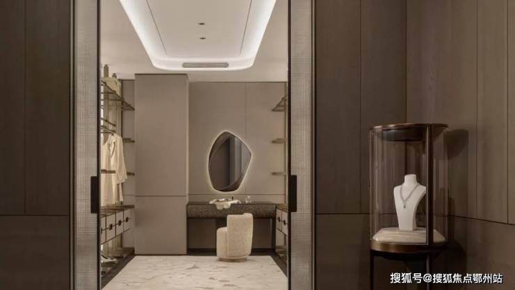 主卧双开门进来,先有个玄关,转入超大的衣帽间,相当于别人的卧室大小,中间设置岛台,首饰盒摇表器,配置安全屋防弹门。主卧形成洄游动线,正面看莲花碗,主卫是圆形浴缸。如果主卧能单独配个起居室则会更好。