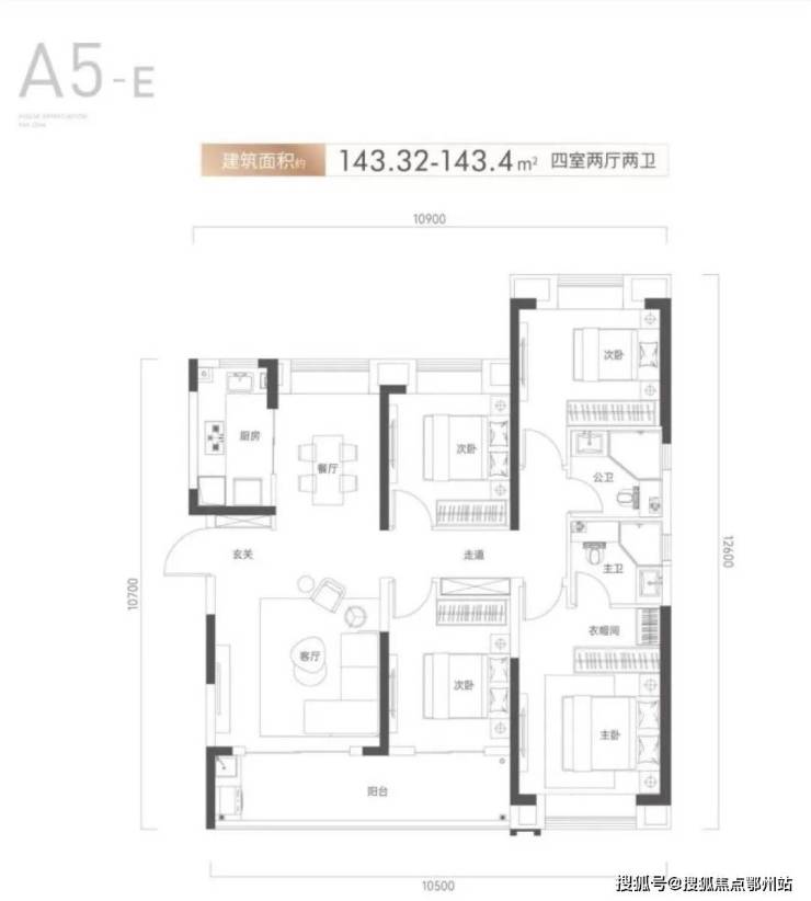 建面约143㎡的A5-E户型,4室2厅2卫:边户,三开间朝南;南北通透,南北双阳台,主卧带独立卫生间,并且因为是3梯4户结构,旁边有两部电梯。