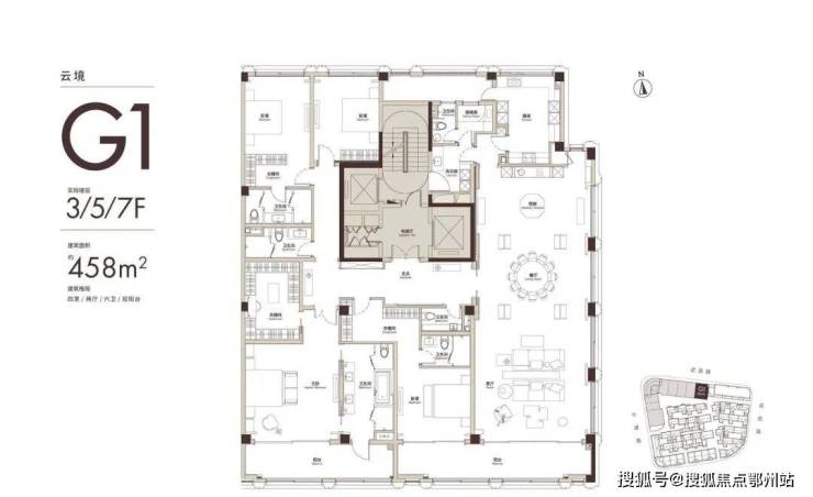 建面约458㎡4房G1户型,设 南向双阳台与约270度三面环幕窗,打通阳台、客餐厨,形成 约19.1米南向与约22.1米东向超宽面宽,保障室内全天自然光,减少人工照明,构建健康节能居住场景。