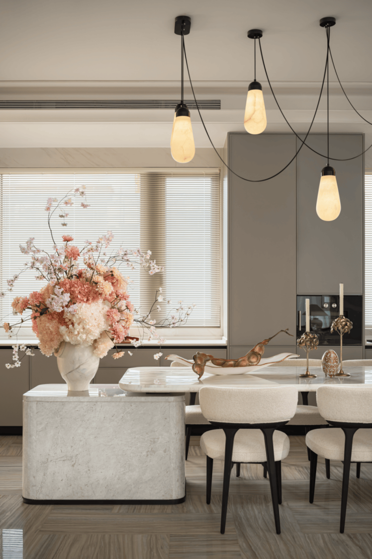 项目萃取西湖北山街民国建筑灵感,将新新饭店类孟莎式屋顶、欧式竖条窗进行当代转译,以进口莱姆石、铝板搭配大面玻璃,勾勒出兼具复古韵味与现代感的建筑轮廓。西湖民国基因与真材实料的质感,重新定义高端湖居品质。