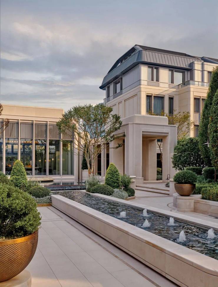 穿门而入抵达「 柱廊玄厅 」,只见两侧方形立柱以及通透的回廊,将喧嚣隔绝在外。你再缓步前行,就能看到以古典主义园林水景+泉池的设计手法打造的「 美泉镜池 」,这一方几何图形的水景庭院,让你收获满满的松弛感。