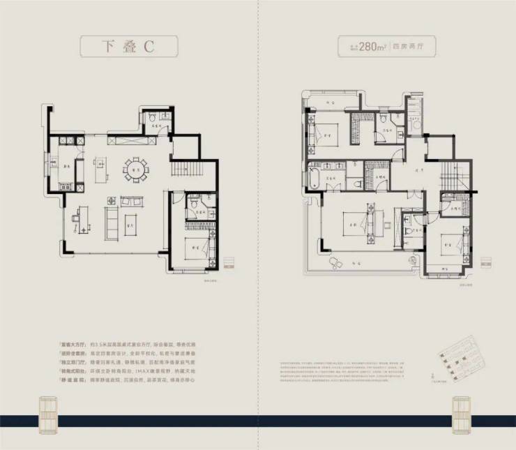 建面约210-280㎡纯4层叠墅,通过上叠北庭下叠南院,独立归家动线、约6m层高地下空间与全套房设计等,推动叠墅空间进化。精装上,嘉格纳、博世等百年品牌加持,尽显极简优雅。