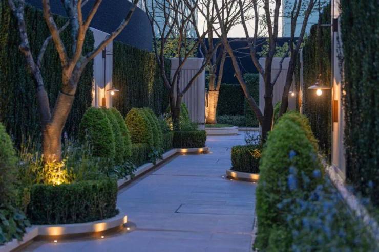 他们还让同样璀璨的花窗,浮现在大堂背后的花园里,这需要室内设计与景观设计的协同。于是,大堂背后的中轴花园,仿佛是大堂外那座庭院的优美镜像,无穷的对称与镜像,映射着你内心的无穷宇宙。
