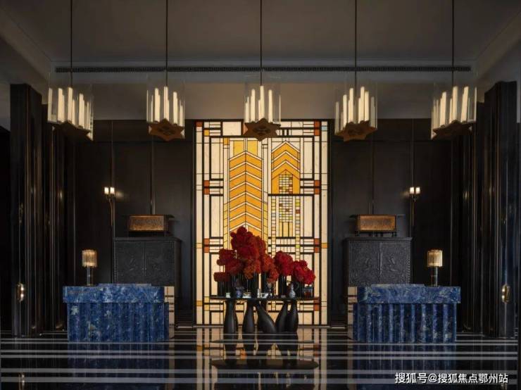 其次,项目的很多细节都融入了海派经典元素,比如落客区美轮美奂的 约300㎡彩色玻璃穹顶 ,艺术连廊拱形廊道灵感都来自和平饭店。彩绘花窗的拱门造型则取自武康大楼。